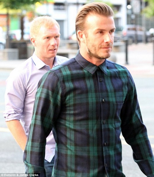 Beckham arrived with Gary Neville and Paul Scholes looking remarkably fresh faced after their night out together on Monday.