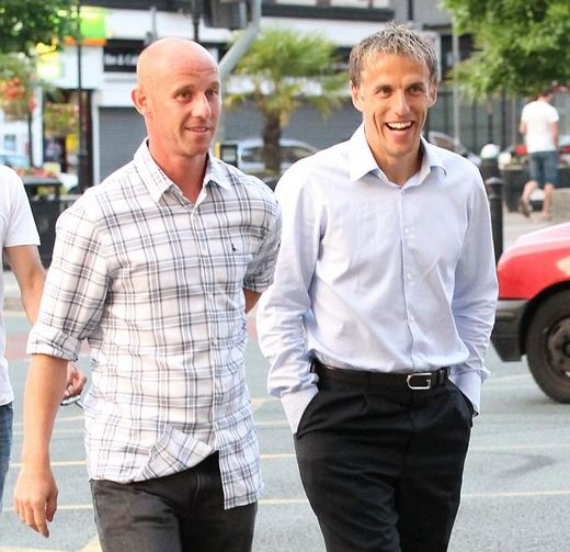 Smart move: New United first-team coach Phil Neville dressed up for the occasion
