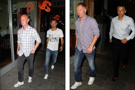 Don't tell Fergie: Beckham, Scholes, Butt, Giggs, Gary Neville and Phil Neville paint the town red
