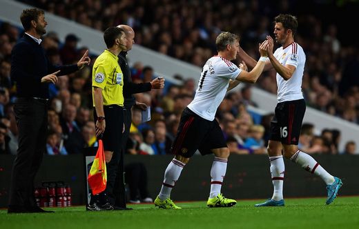 With Villa in the ascendancy and the home fans in fine voice, Tim Sherwood intervened and sent Rudy Gestede onto the pitch in place of former Manchester City midfielder Scott Sinclair. Van Gaal also made two changes on the hour as Ander Herrera and Bastian Schweinsteiger came on for Januzaj and Carrick, perhaps with a view to regaining control of an increasingly frantic match.
