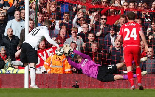 The Reds couldn’t expect an easy ride to the final whistle and that was brought sharply into focus as Sturridge beat De Gea at his near post on 69 minutes to set up a nervous finish. But United held onto the lead, although it could have been more secure had Rooney not had a late penalty saved by Mignolet after Daley Blind was brought down by Emre Can. It’s as you were in the top four, but crucially there is a five-point gap back to Liverpool and after consecutive wins over the Merseysiders and Tottenham, van Gaal’s men have gathering momentum going into the final eight games of the season.