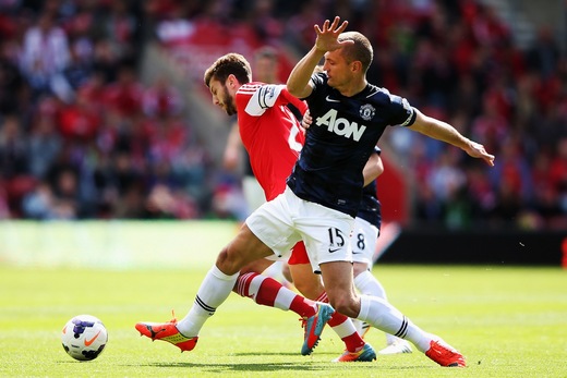 Sub-plot: Vidic bade farewell to the club after eight years and he went out in true warrior-like style. He was furious with the challenge on him from Lambert, which led to a bloodied nose for the Serb and a goal for Southampton, but after some treatment and a change of shirt, he went up the other end and headed just wide from a free-kick. A yellow card completed an action-packed first period for the skipper. Whether or not this is the last match we’ll see of fellow defenders Rio Ferdinand and Patrice Evra in a red shirt (well, navy today), given the end of their contracts this summer, remains to be seen.