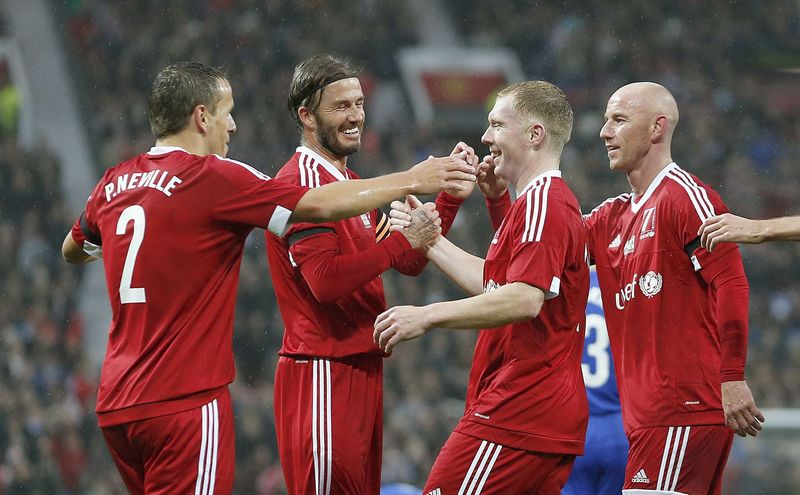 Scholes sliced two volleys wide as Beckham's Reds pushed for another, with plenty of camaraderie between old friends on show in the pouring rain.