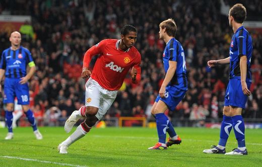 The joy in the stands was tempered a minute later when Owen, who appeared to have injured himself while attempting to reach Jones' cross, limped down the tunnel and was replaced by Javier Hernandez. It was United's two full-backs, though, who came closest to adding a second before half-time. First Fabio embarked on a dribble from the left-back position that only ended when his attempt to roll the ball across goal for Berbatov was blocked by a last-ditch tackle. Along the way he'd left countless Romanians in his wake.