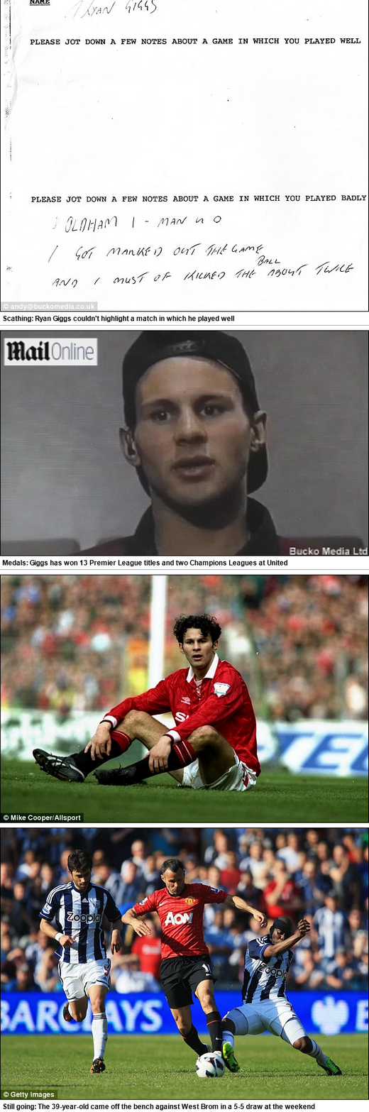 He did, however, make a note that his performance against Oldham wasn't good enough. Giggs wrote: 'I got marked out of the game and I must of kicked the ball about twice.'