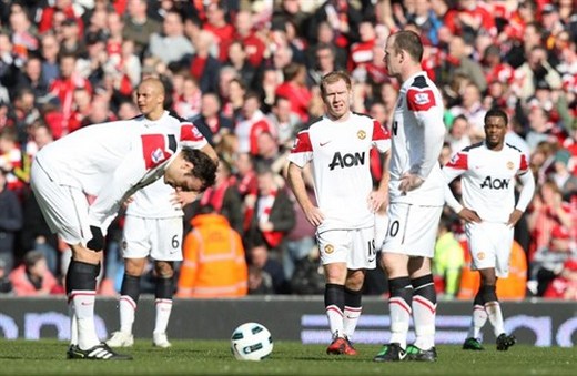United’s quest to regain the Barclays Premier League title suffered a second successive setback as Dirk Kuyt’s hat-trick gave Liverpool a deserved victory at Anfield.