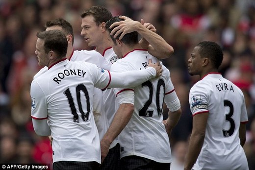 Arsenal had the better of the early first-half play; always lively in central positions and looking capable of opening up United’s defence. On one such occasion, Lukas Podolski forced a save from De Gea with a powerful shot from a tight angle after 32 minutes. But United grasped control and finished the half as the stronger side and, indeed, on level terms. On 39 minutes, Nani broke away down the left and crossed for van Persie, whose header from point-blank range struck Szczesny in the face, and two minutes later Jones headed wide again from an arcing Antonio Valencia cross.