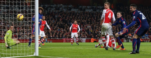 Antonio Valencia's low shot after 56 minutes was inadvertently deflected by Gibbs into his own net to give the Reds the lead, then Rooney finished off an incisive counter-attack to make it 2-0. Angel Di Maria could have made it 3-0 late on but missed a good chance and Olivier Giroud pulled a goal back to make it a nervy finish. But this was a commendable performance of persistence from United in testing circumstances.