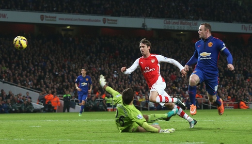 United’s first opening came from a set-piece on 21 minutes as Rooney fired over the bar. It was rare relief from previous one-way traffic and United had De Gea to thank again when he forced Oxlade-Chamberlain wide in a one-on-one and saved the Arsenal man’s shot with an outstretched leg.