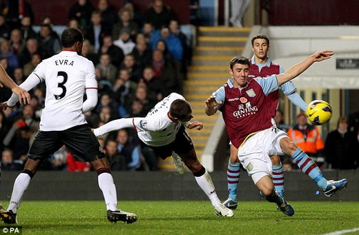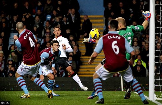 Ashley Young, jeered on his old stamping ground, collected a Scholes pass to bend a shot wide but he had to make an important block at the other end when Christian Benteke shaped for a volley inside the box. Villa enjoyed some dangerous moments with Weimann wasting a three-on-two break and Rio Ferdinand having to clear when Benteke sprung the offside trap.