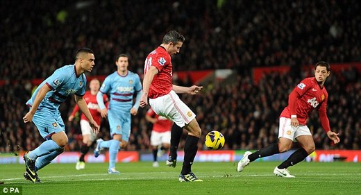 Robin van Persie scored after just 33 seconds at Old Trafford to vanquish West Ham and maintain Manchester United’s position at the summit of the Barclays Premier League.