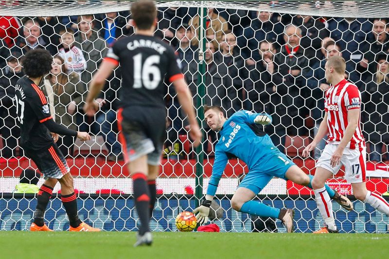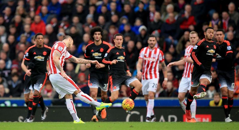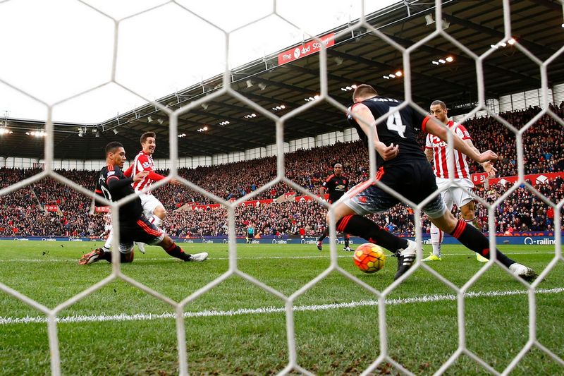 In typically windy conditions, with strong gales blowing through the exposed corners of the stadium, the opening exchanges were scrappy and the weather played a small part in Stoke taking the lead on 19 minutes. Memphis, faced by a bouncing ball, tried to head back to David De Gea but failed to muster enough power, allowing Glen Johnson to intercept and set up Bojan for a simple finish from inside the box.