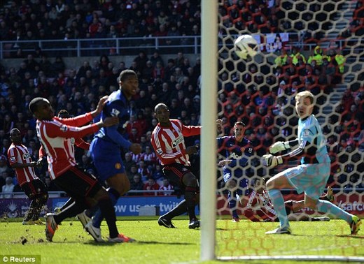 The hosts' aerial approach was repelled superbly by Vidic, Evans, Smalling and Büttner, while De Gea was up to the task when Connor Wickham registered Sunderland's first shot on target in the 90th minute. Van Persie almost added a second goal with the final kick of the game, only for Mignolet to bravely block his effort.