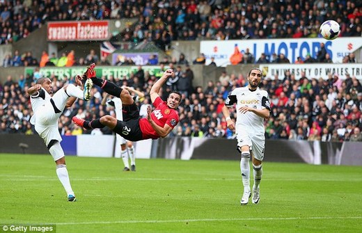 Robin van Persie, on his 50th United appearance, continued his scoring start to the campaign with a brilliantly improvised volley on 34 minutes, and just two minutes later Danny Welbeck turned home from close range after being teed up by Antonio Valencia. It hadn’t been plain-sailing before that; Swansea started strongly – literally, with some stern challenges.