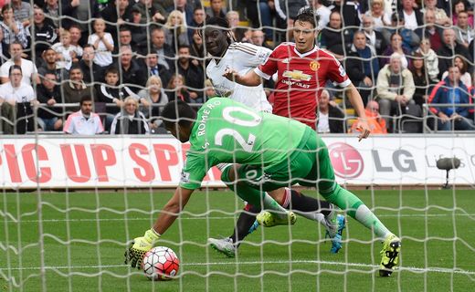 Having offered very little in attack up to that point, Swansea suddenly had three opportunities in as many minutes. Jonjo Shelvey free-kick was flicked on by Gomis to Gylfi Sigurdsson who flashed a low drive inches wide of the post with Sergio Romero beaten. The Argentinian stopper then presented possession to Shelvey 25 yards out. He pinged an effort immediately towards goal but Romero managed to get back in position to claim. The Swans then went even closer through Gomis who turned and cut in from the right before striking a shot with the outside of his boot off the far post.
