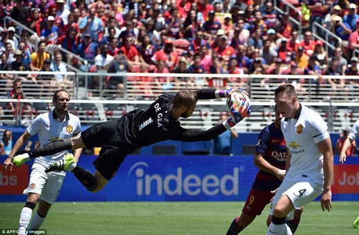 Barcelona had the best of the opening chances with Suarez hitting the post with an impressive free-kick, while De Gea pulled off an excellent save from Sergi Roberto when the Barca man was clean through.