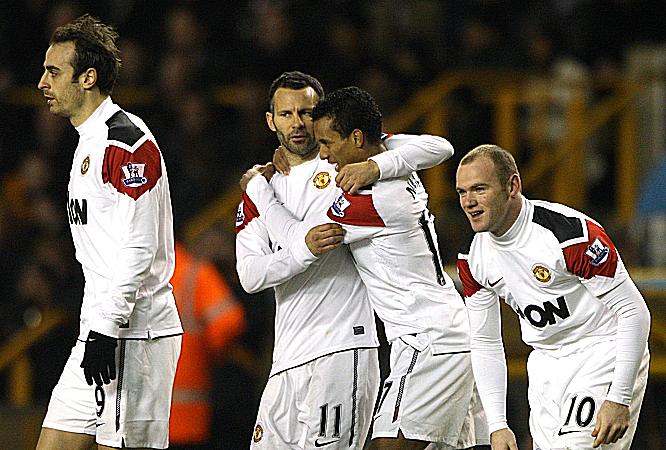 Scholes came close to nabbing a leveller shortly before the hour, but he could only slide a finish off-target after racing onto Rafael's low cross. Soon after, Sir Alex replaced the injured Evans with Smalling, and introduced Chicharito at the expense of Berbatov.