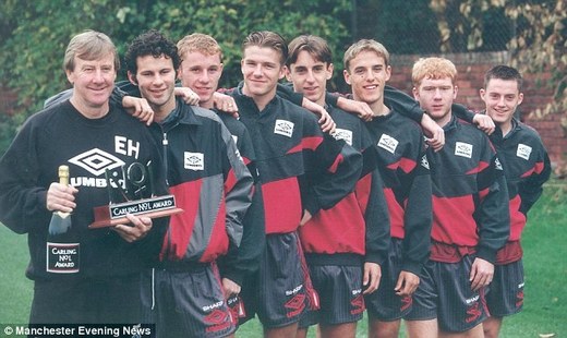Stars of the future: Giggs with coach Eric Harrison (left) Nicky Butt, David Beckham, Gary Neville, Phil Neville, Paul Scholes and Terry Cooke in 1995