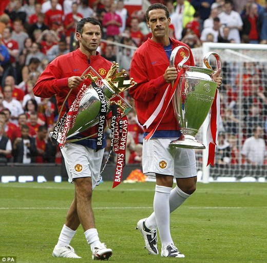 Stalwarts: Giggs and Rio Ferdinand (right) parade their spoils on the pitch at Old Trafford