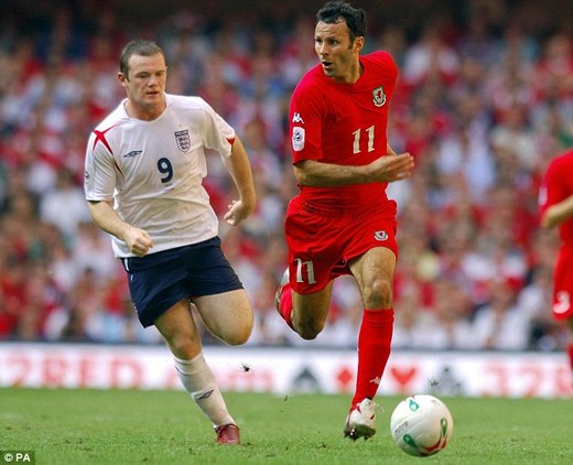 Ryan Giggs skips past Wayne Rooney in Wales' 1-0 World Cup qualifier defeat at Cardiff in 2005