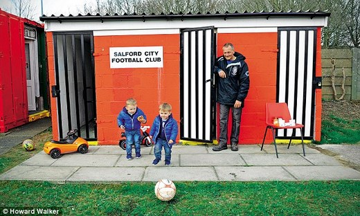 Caretaker Jimmy at the club's Portakabin with his grandsons. Salford City fans shouldn’t expect an array of former United stars to start trotting out of the home Portakabin however