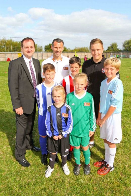 Footballing legend Ryan Giggs with youngsters from Flint Town United FC and McDonalds franchisee Stewart Williams