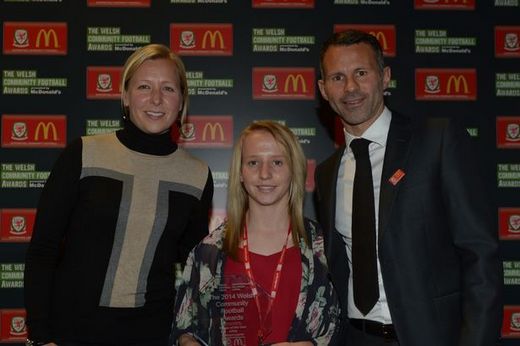 Lauryn Lyons from Hawarden was presented with the Player of the Year (girl) award by Ryan Giggs and Jayne Ludlow at the The Football Association of Wales (FAW) Community Awards